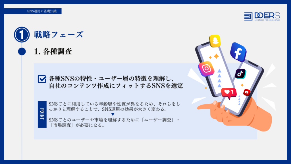 SNSごとのユーザーや市場を理解するために「ユーザー調査」・「市場調査」が必要になる。