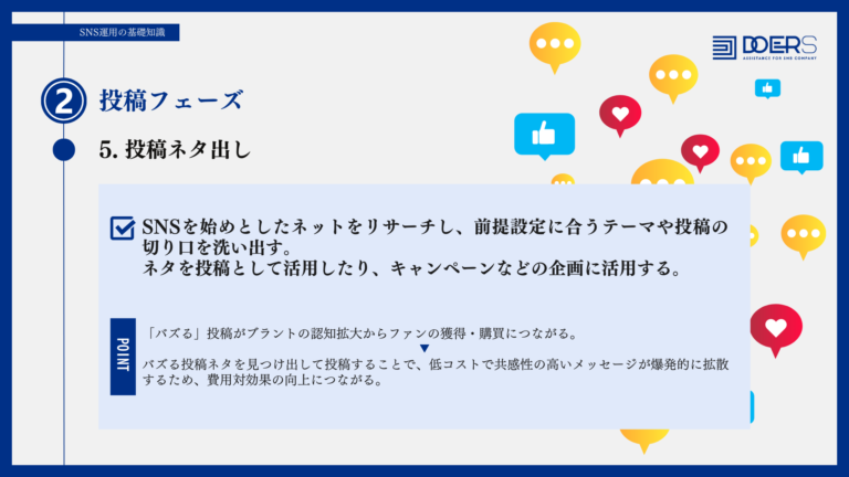 バズる投稿ネタを見つけ出して投稿することで、低コストで共感性の高いメッセージが爆発的に拡散するため、費用対効果の向上につながる。