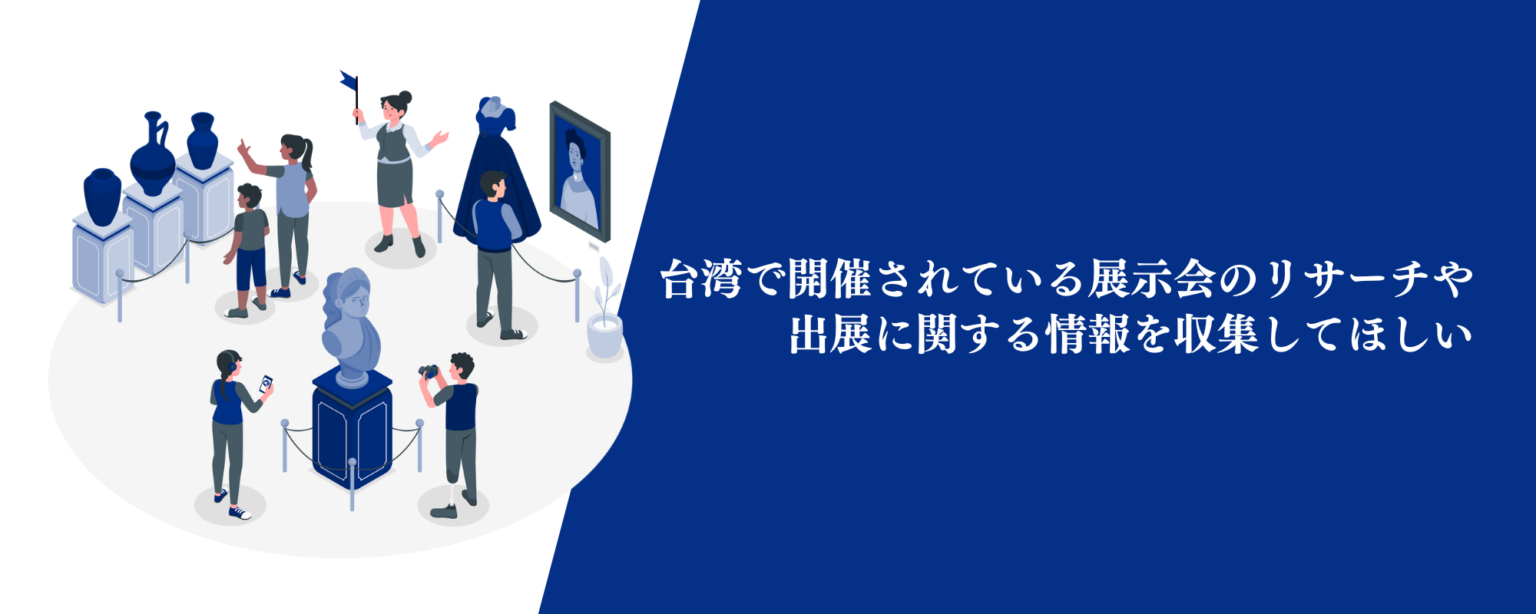 クライアント様方の販路開拓に向けた取り組みのお手伝いとして、台湾で開催されている展示会のリサーチや出展に関する情報を収集しお伝えします。クライアント様側のスタッフの様なイメージで、展示会事務局との調整や出展手続きの代行もいたします。